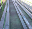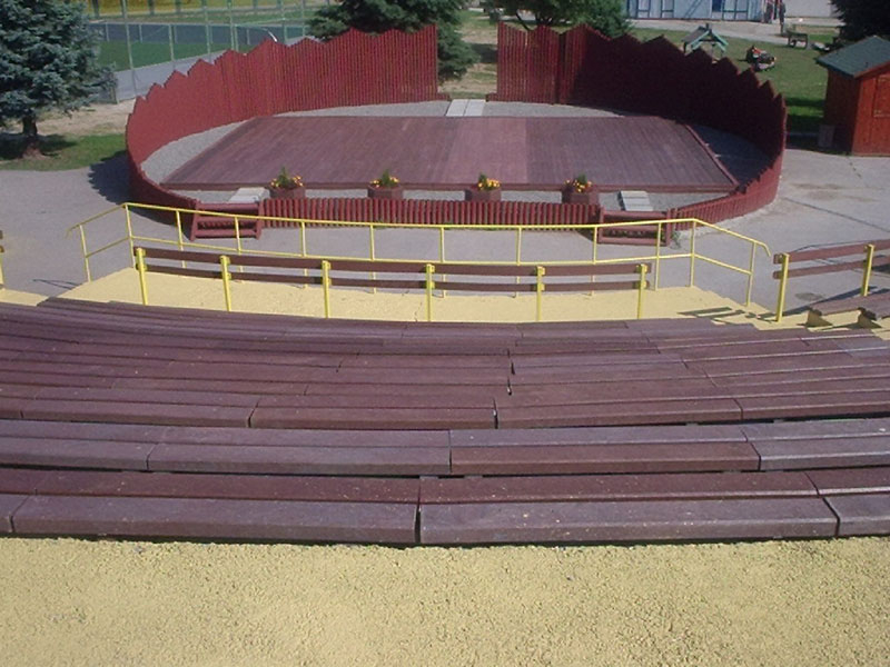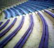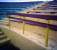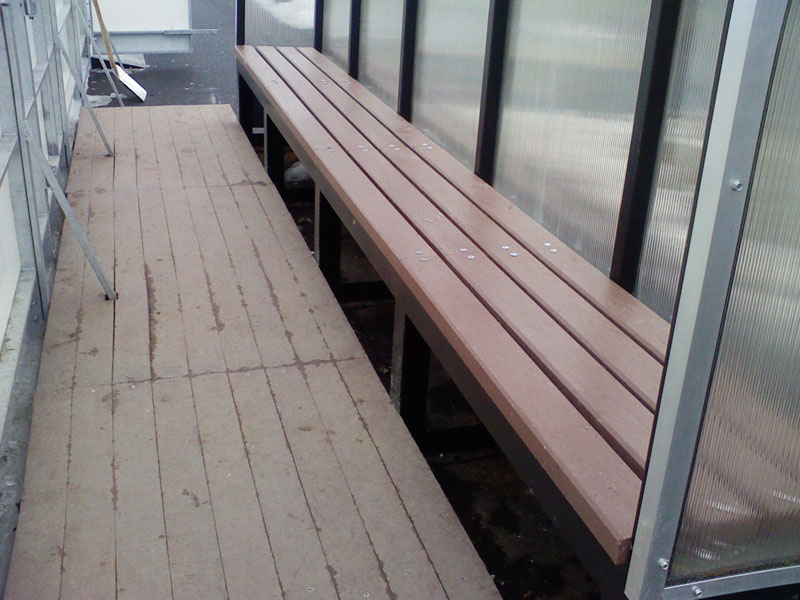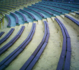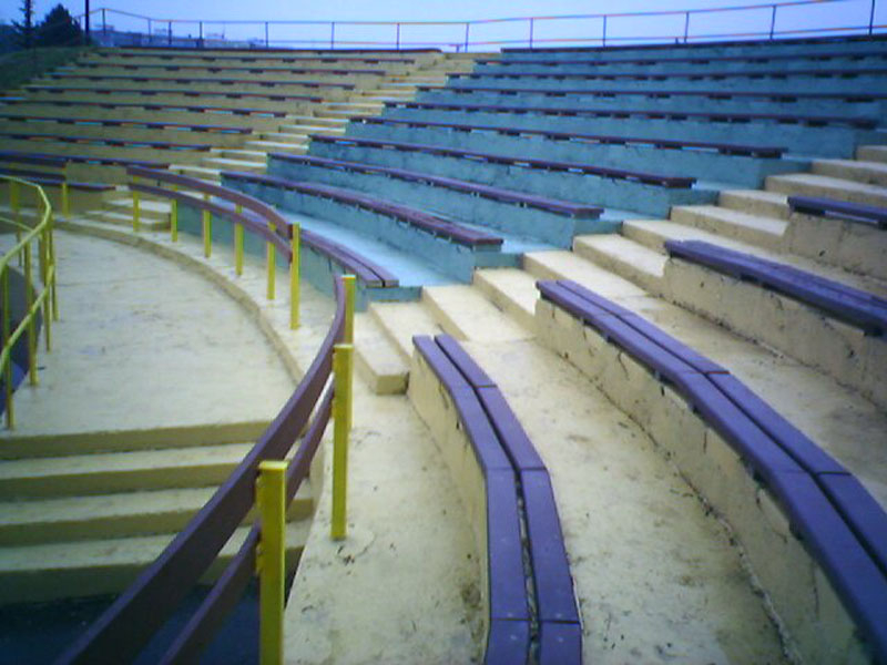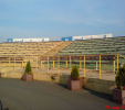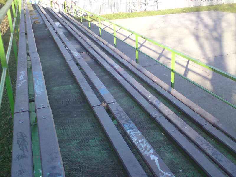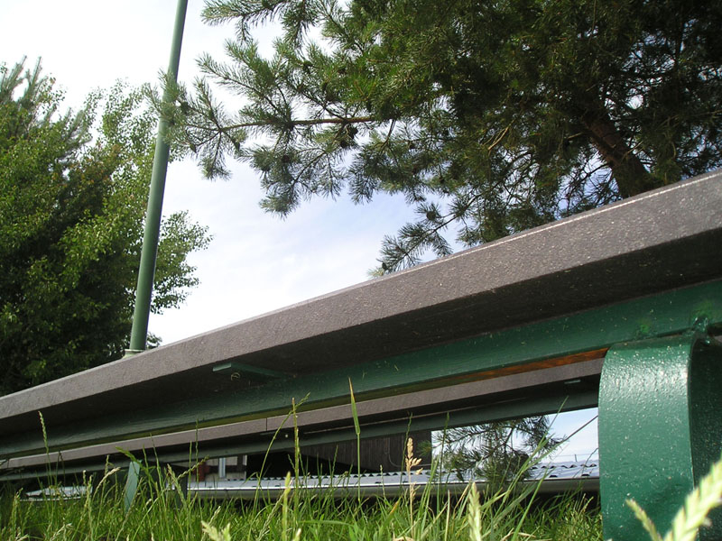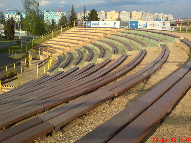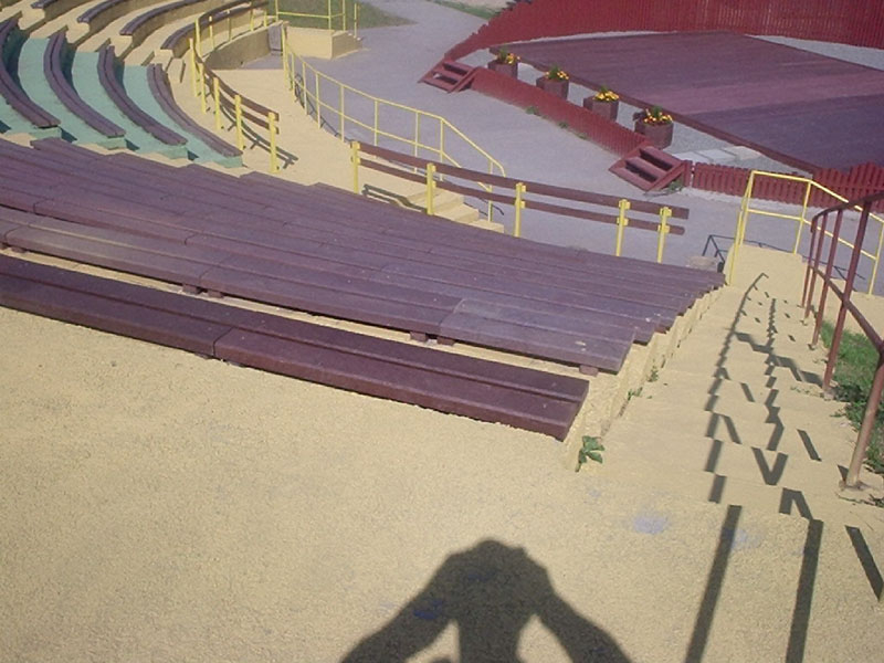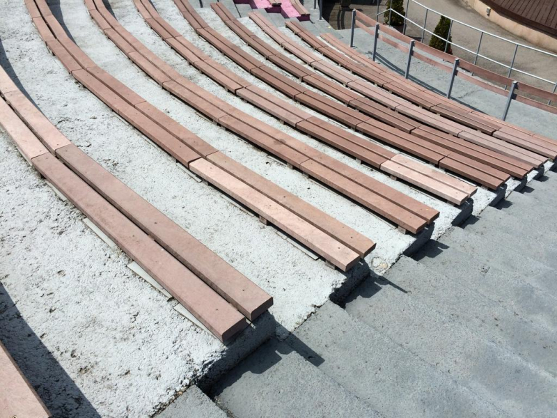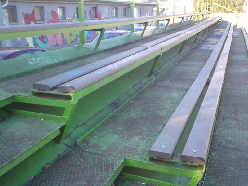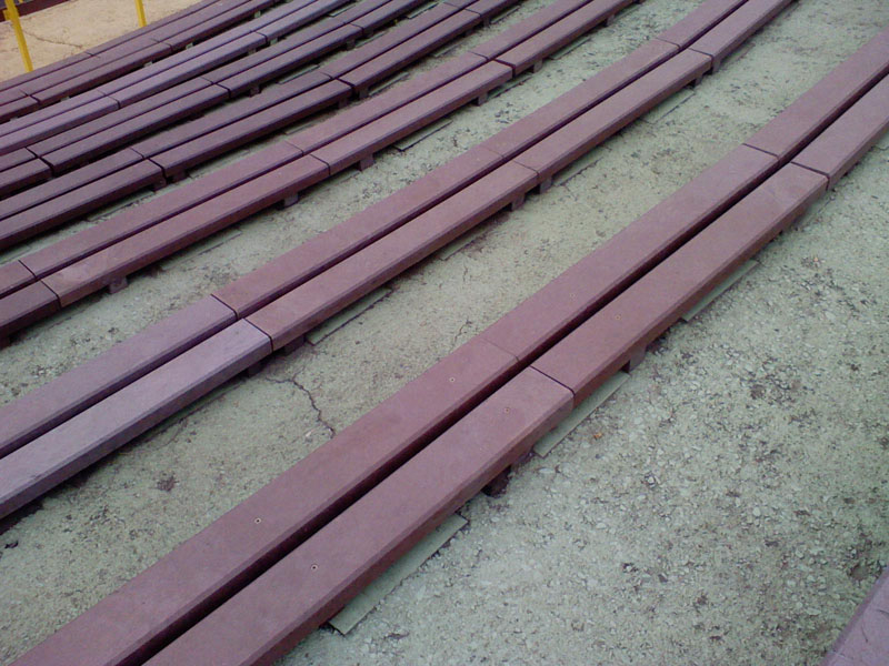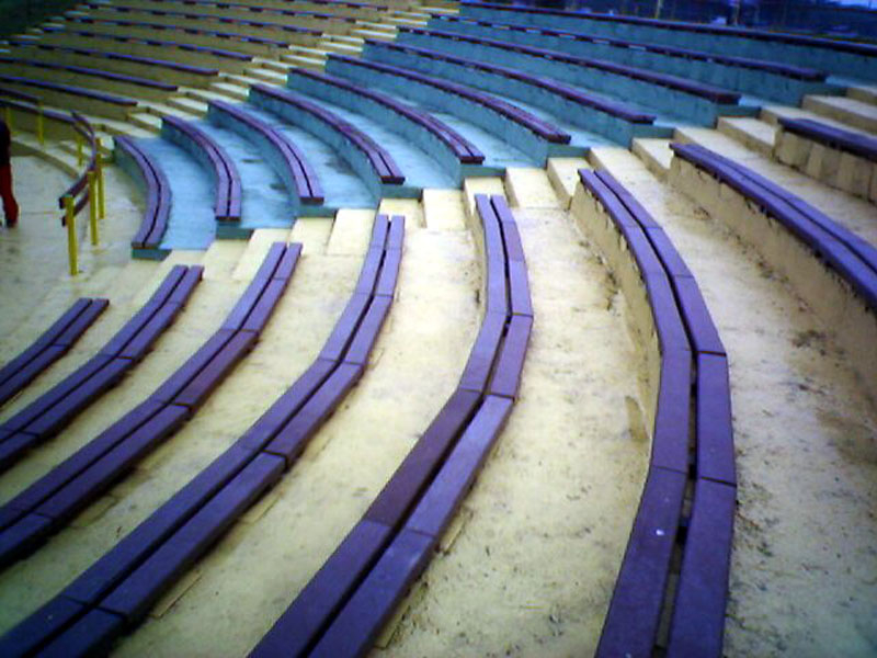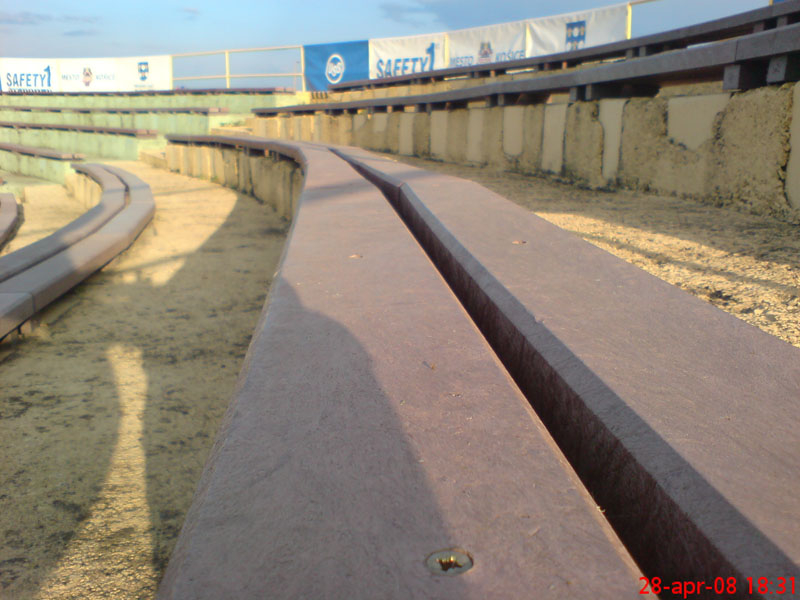 Amphitheaters, bleachers, sittings, either of concrete or metal structure - everything like this, represent a suitable place for the use of plastic plates. Boards of different profiles can be directly anchored in concrete - ground by charging plugs, or we can produce plates - sittings of different sizes by setting two or three panels side by side. The most common profile, used for the construction is D-120x50-2200 (w x h x l) in mm, this profile can be reinforced by 20/5 iron flats in the full length or in part. When used directly on the concrete, the thinner profile D-130x35-2000 or 110x35-D-2000, D-100x25-1800, anchored through 8/100 charging plugs will do the job. We can prepare the plates in various color designs - variations.