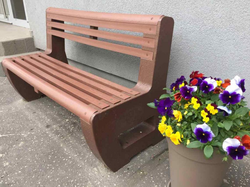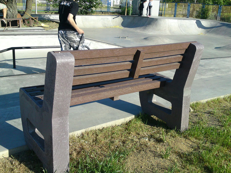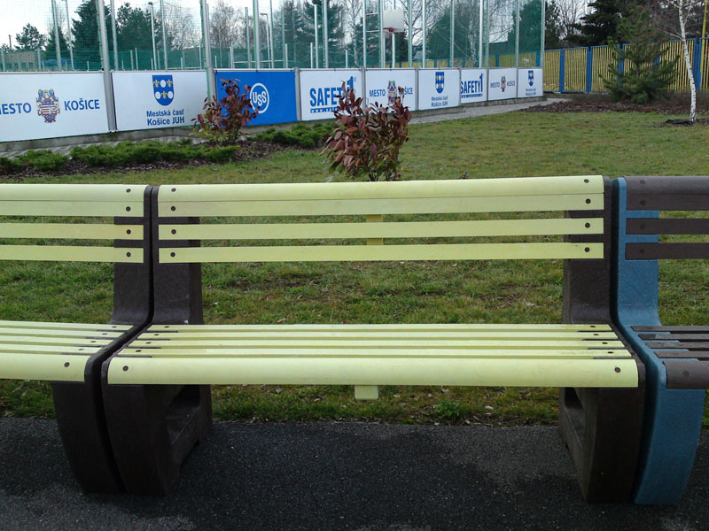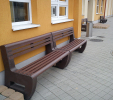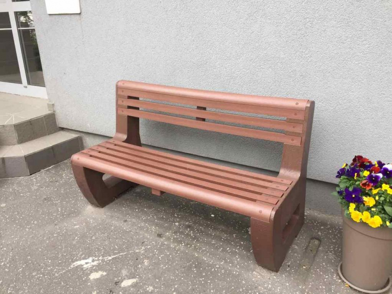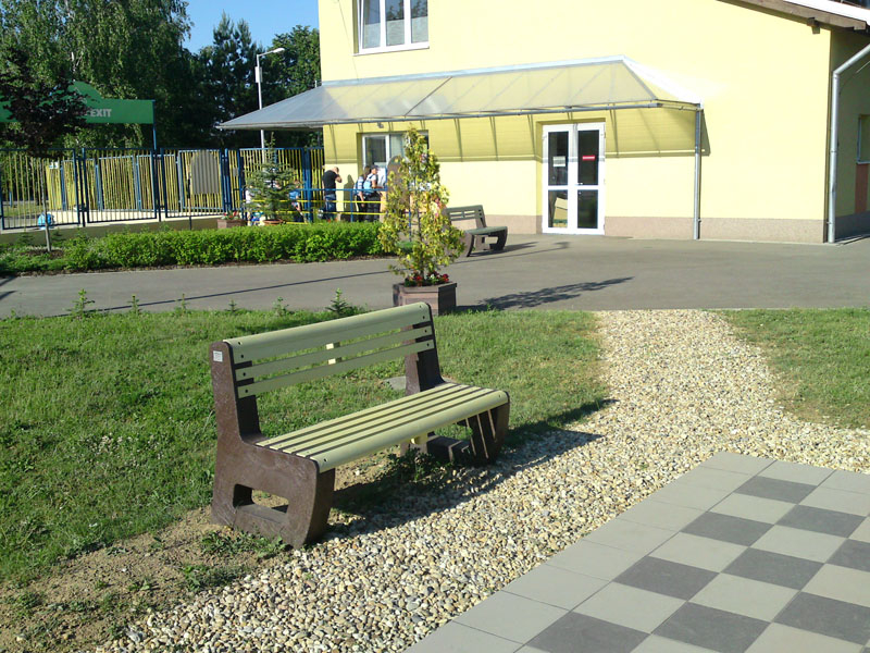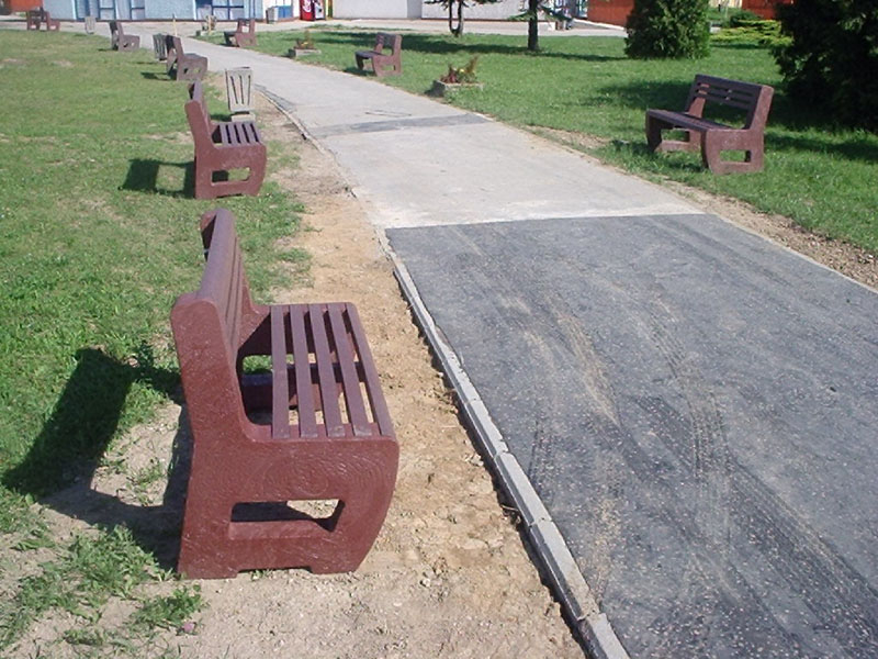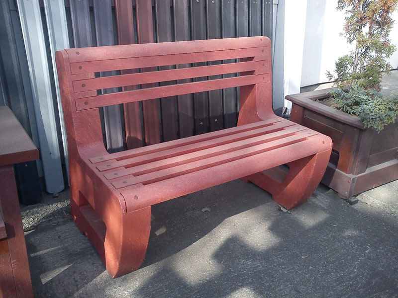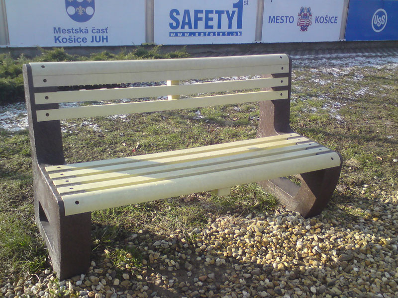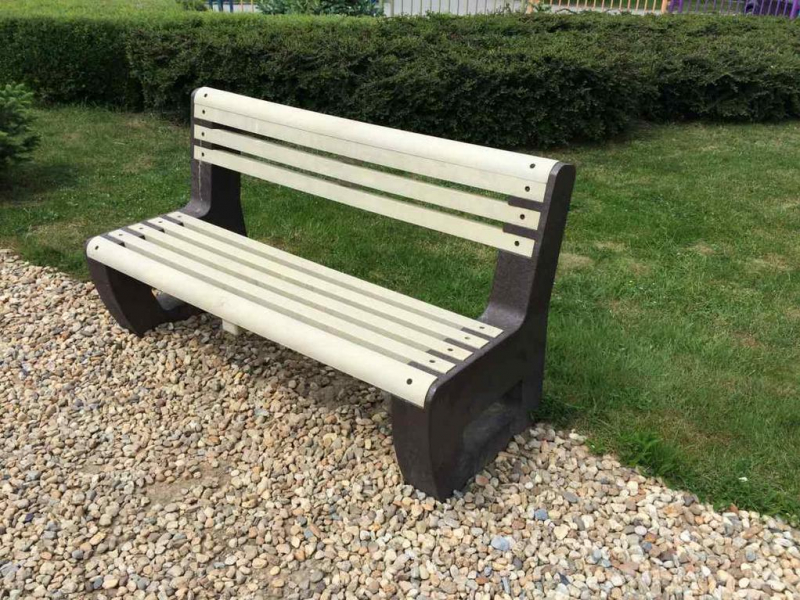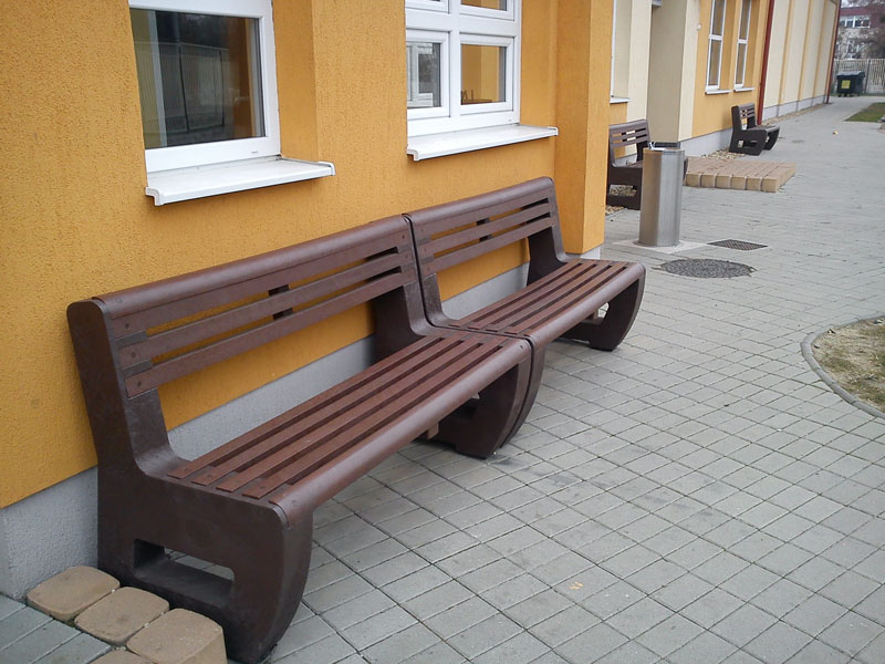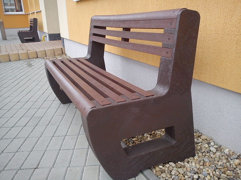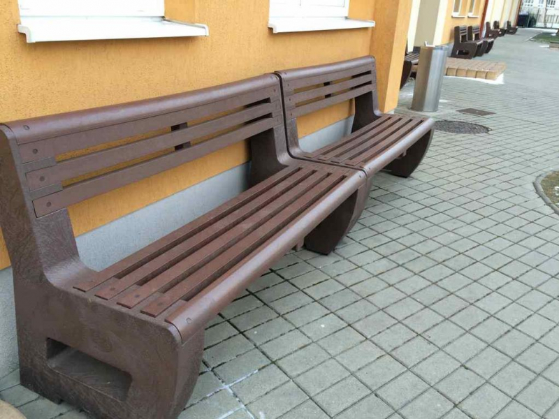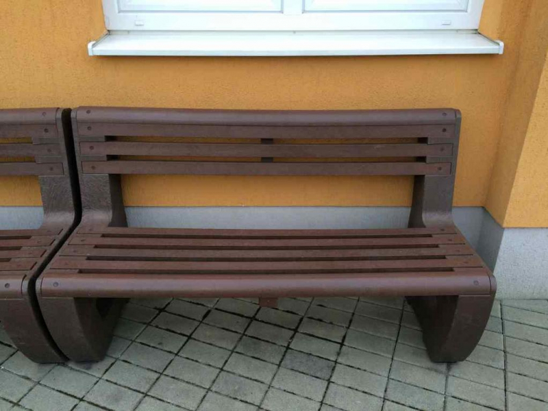 L-type bench is very popular due to color variations. Massive, 90 kg solid plastic bench is fully suitable for exteriors of municipalities, parks of businesses and organizations - more than 1000 units of benches sold. Of course, the most common color is brown in a dark or light combination. Product as a whole is resistant to mechanical damage and vandalism. It can be anchored directly to hard surfaces using L-iron or into a loose soil with bases that can be buried into the ground.