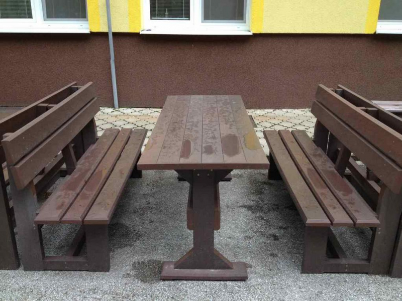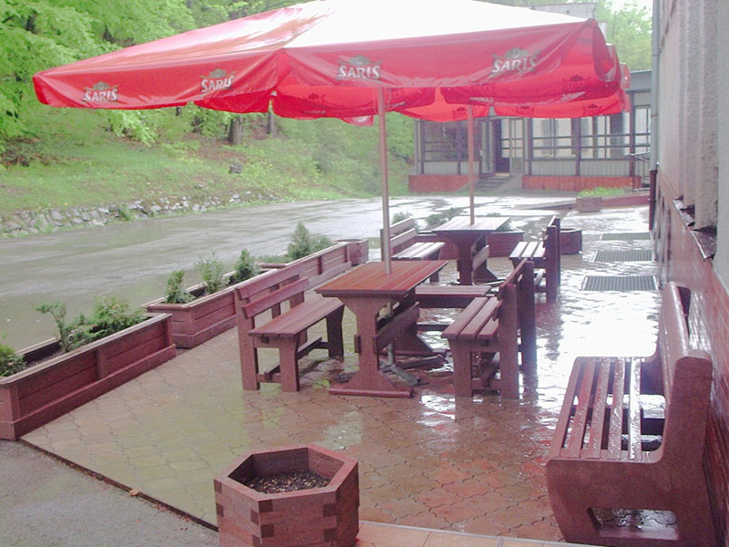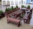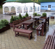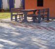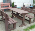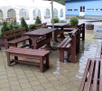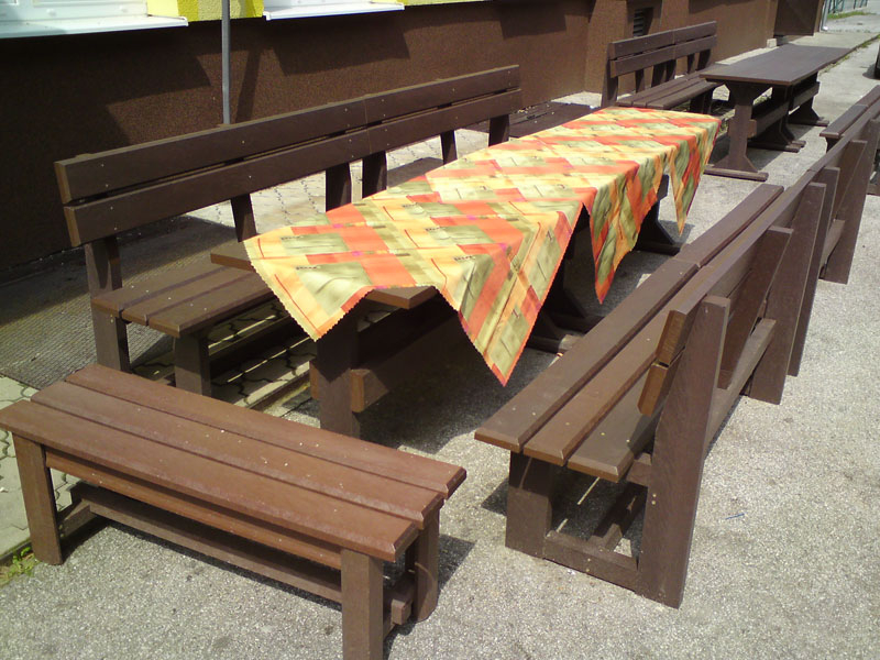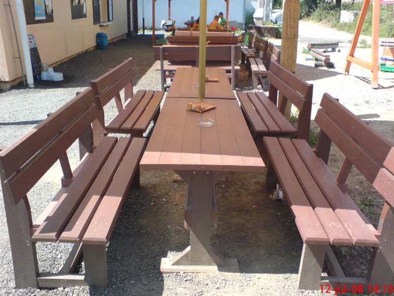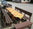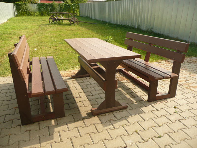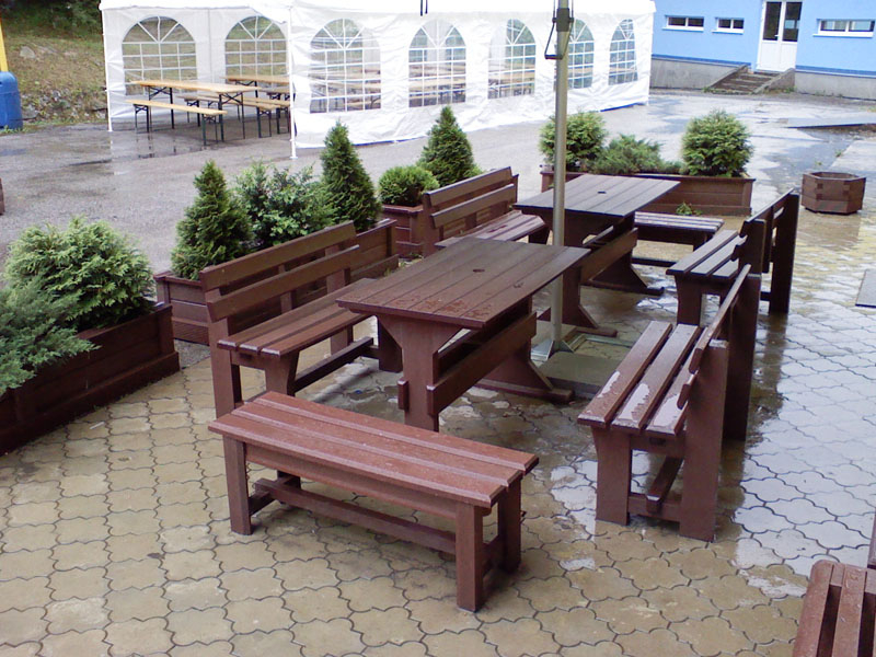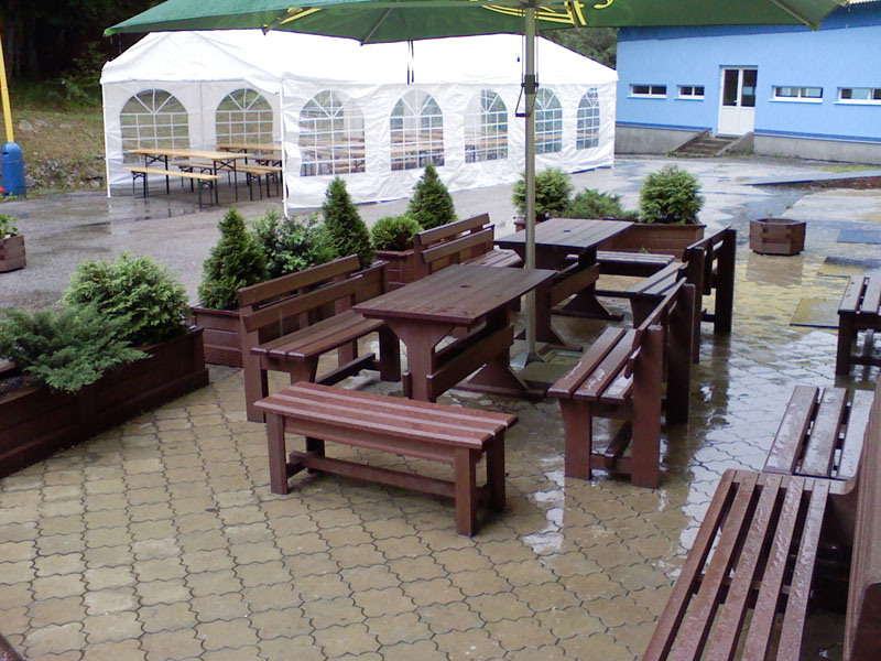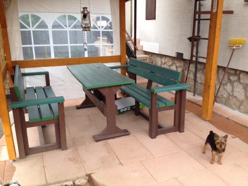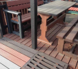 Garden furniture consists of a table and two benches. The product can be material-produced both of plastics and wood. Several variants can be chosen: for example, a classic table with two "legs" and two benches with a backrest, or a more massive table with four legs, made of the solid prism 9x9 cm and benches, for instance, also without backrests. We can also produce a variety of other seating products, such as armchairs with armrests, or small stools without a backrest and so on. For this product, a floor is an ideal add-on design, which is supplied in two - three types of profiles, such as the profile D-120x40-2200 / w x h x l / in mm. It is a good design for inaccessible-terrain cottages and gardens, which would otherwise require other construction works, and by means of such a platform, completely made with us or made by yourself, a maintenance-free, patio antiskid floor, lasting for many years can be easily created. Section 11. Terrace slabs.