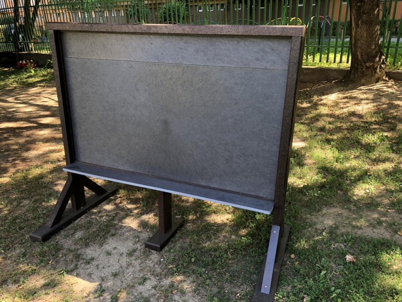 Informačná tabuľa s priestorom na ukladanie kried. Vhodné na školský dvor, pre škôlky.