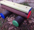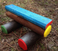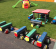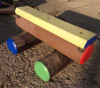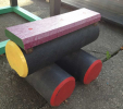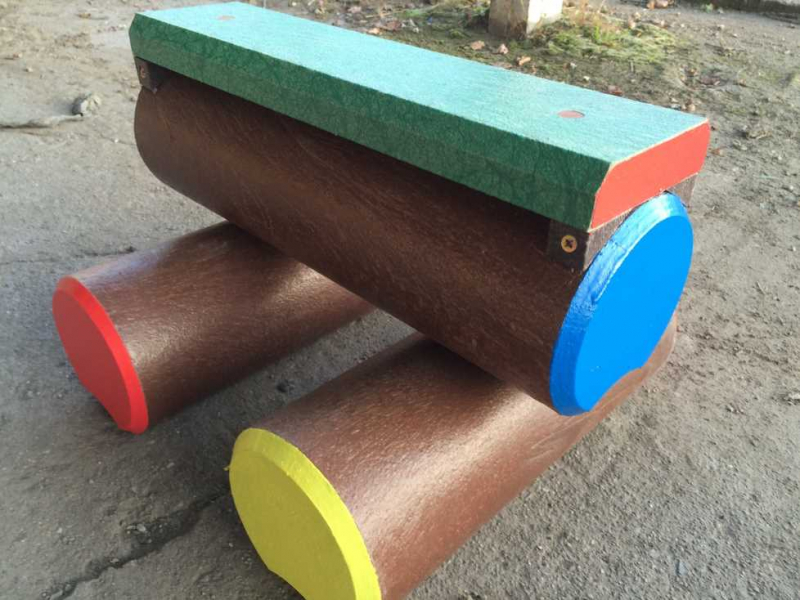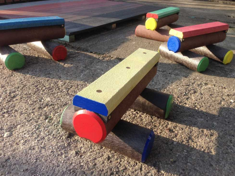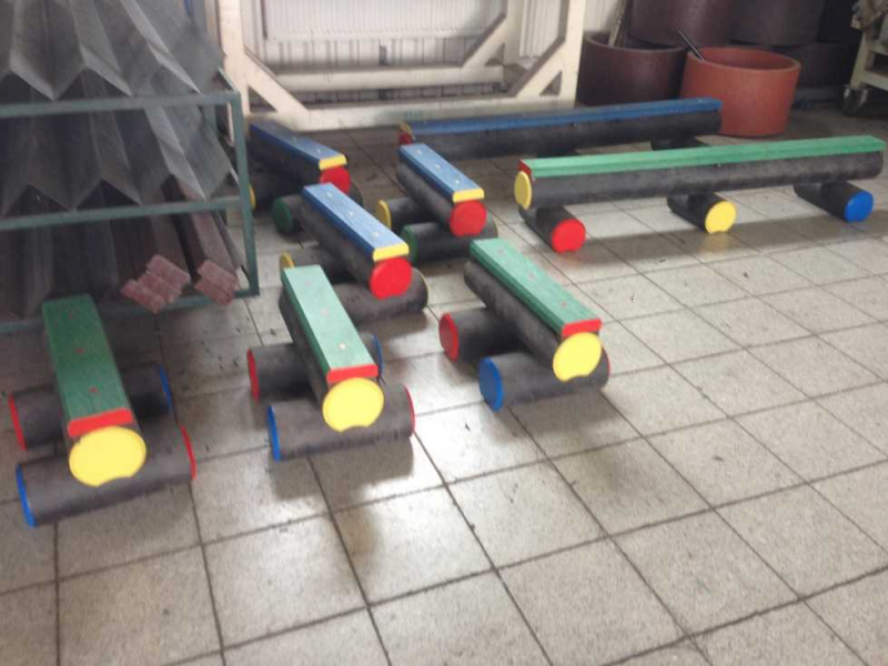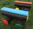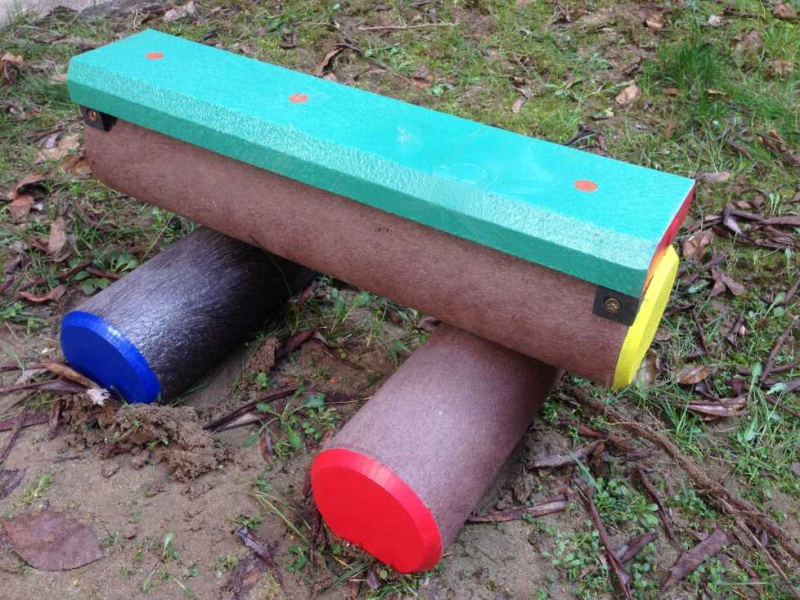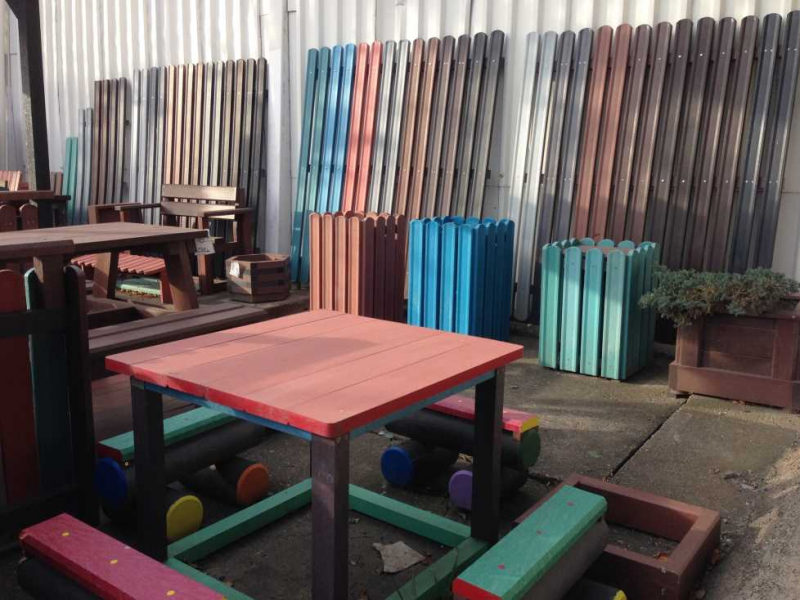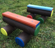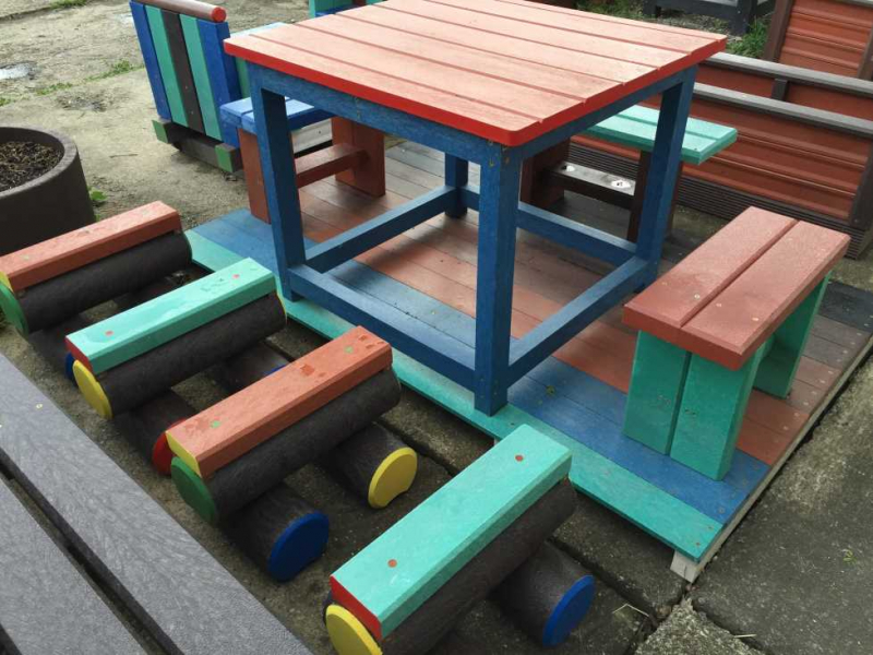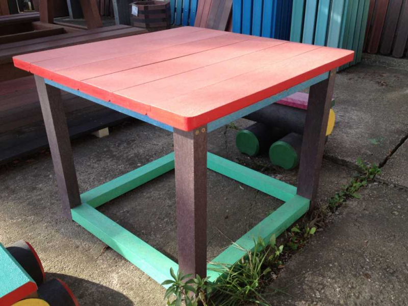 Malý stôl s rozmerom približne 100 x 100 cm a k nemu malé kladinky sú veselým doplnkom každého školského dvora. Na výber je pestrá paleta farieb.